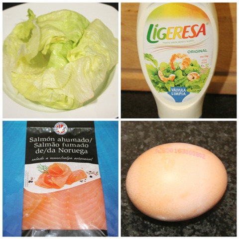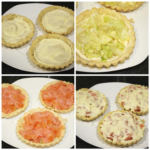 Una vez frías vamos a rellenarlas. Ponemos una primera base de mayonesa, seguidamente incorporamos la lechuga, partida bien pequeña. Ponemos ahora el salmón partido también pequeño. Acabaremos con una nueva capa de mayonesa y, por último, pondremos el huevo duro rallado por encima.