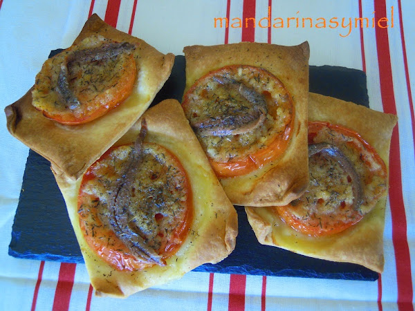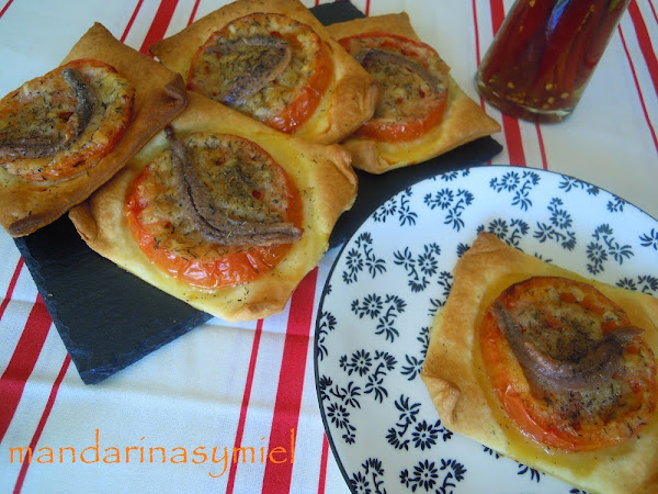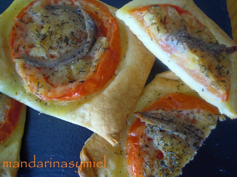 He querido recordarlas porque son riquísimas y son muy Typical Spanish, pero ya las tengo en el blog, y no las puedo repetir.....pero os dejo otro entrante que se hace mucho en mi casa, unas tartaletas con hojaldre, masa de empanadas, masa de cerveza...de lo que queráis, con tomate, unas anchoas o sardina de bota y tomillo, son riquísimas y de lo más fáciles de hacer, también se puede hacer sin cortar la masa, tipo coca.