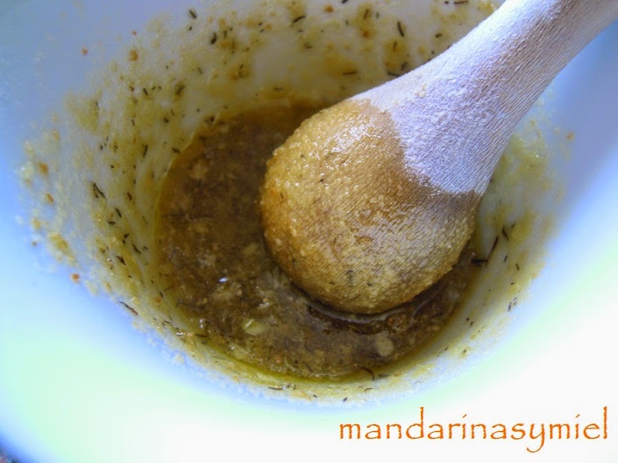 Pica los ajos en un mortero, añade el tomillo, el pan rallado, la sal y un buen chorro de aceite, mezcla todo bien.