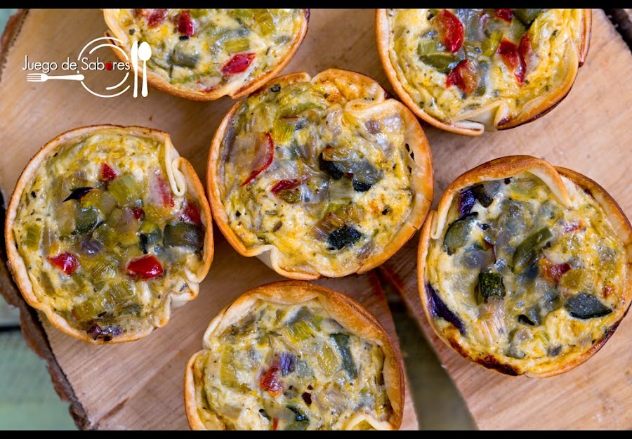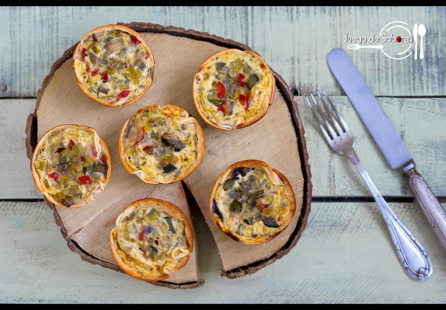 A veces me da la ventolera y me pongo a ordenar armarios. Cualquier excusa es buena: que si ahora empieza la temporada de invierno y mira tú por dónde no tengo nada que ponerme; que si ahora se acerca el calorcito y el bikini de topos ya no se lleva y lo que prima son las rayas?Y qué decir de los bolsos, absolutamente pasados de moda y que se dan de patadas con los zapatos? Bueno, pues con la nevera hago lo mismo. Me da por hacer limpieza, pero no porque huela mal, no, sino para ordenarla y para renovar el material: quitar de en medio aquel calabacín que te mira con cara de pena, eliminar aquella cebolla totalmente olvidada que casi muere ahogada a manos de los pimientos, o aquel puerro en otro tiempo vigoroso y orgulloso de su estatura y hoy delgado y calvo. Pues con todos estos elementos y un paquete de empanadillas que ni sabía que tenía, he preparado unas tartaletas de verduras de lo más resultón. Como hay cambio de temporada pronto tendré que llenar el frigorífico de coles, coliflores, brócoli, acelgas?¡A ver cuánto aguantan en la nevera!