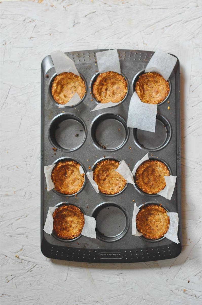 Precalentamos el horno. Y en una bandeja de magdalenas recortamos y colocamos tiras de papel de hornear para que luego nos resulte más fácil sacarlas. vamos colocando masa y aplastando con las manos dando forma de tartaleta en el molde.
