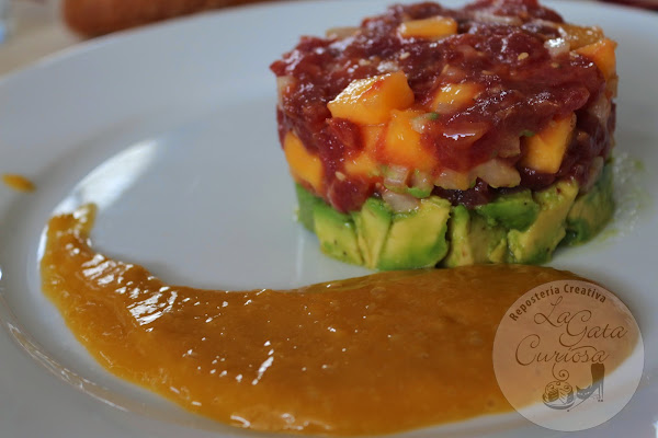 Antes de montar el plato mezclamos el mango y la cebolla con el tartar. Con un aro de emplatar ponemos primero una capa de aguacate y encima el tartar.
