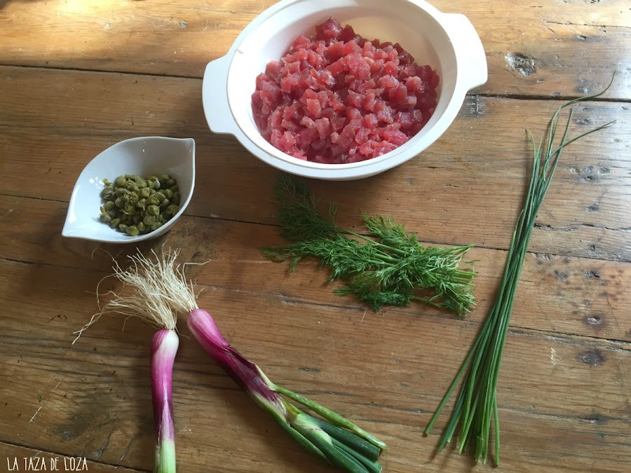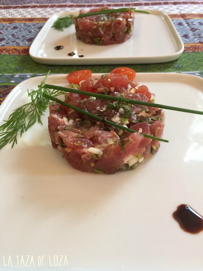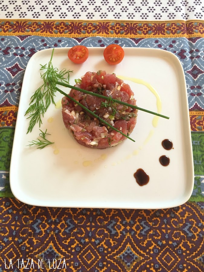 Lo primero es cortar el atún en trozos pequeños y siempre a cuchillo. El tamaño de los trozos de atún va al gusto del cocinero.