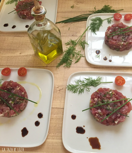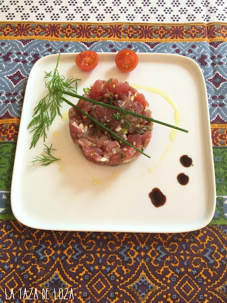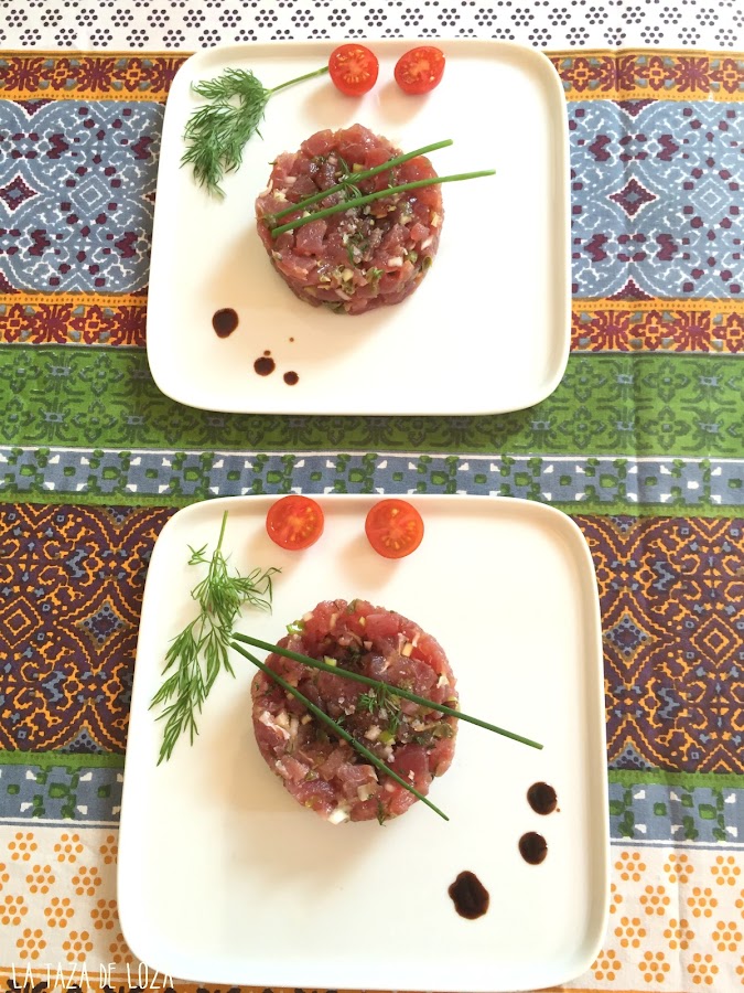 Por último poner unas gotas de salsa de soja (muy pocas), ya que después cuando esté servido se puede poner en un lado o bien en un recipiente pequeño a un lado del tartar de Atún rojo encima del plato de presentación.