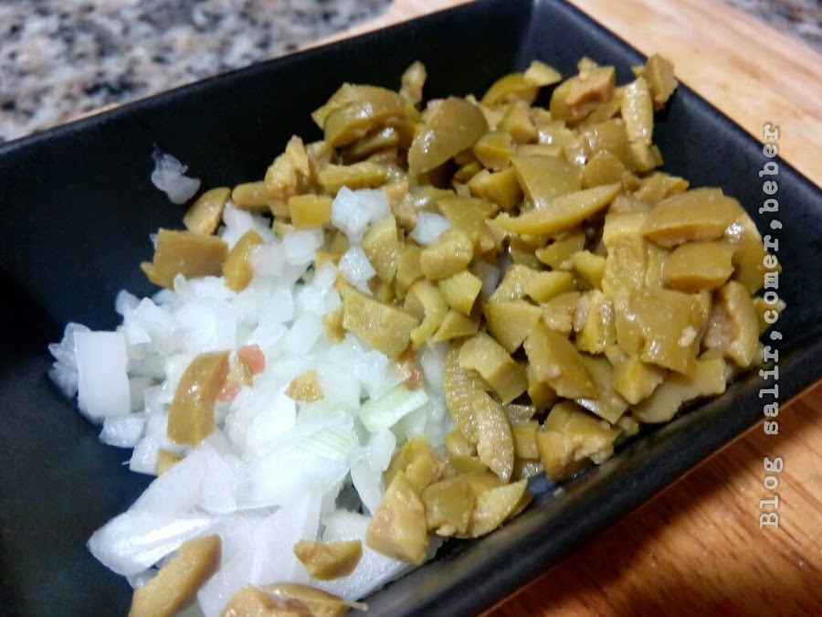 Mezclamos el atún con la cebolleta y las aceitunas y lo maceramos en la nevera con el siguiente aliño: tres cucharadas de salsa de soja, una cucharada de café de mostaza, un chorrito de salsa perrins, un buen chorro de aceite de oliva, bien de pimienta y un toque de sal. Ojo que la salsa de soja es salada por si misma, si os gusta el picante, unas gotas de tabasco también le van bien.