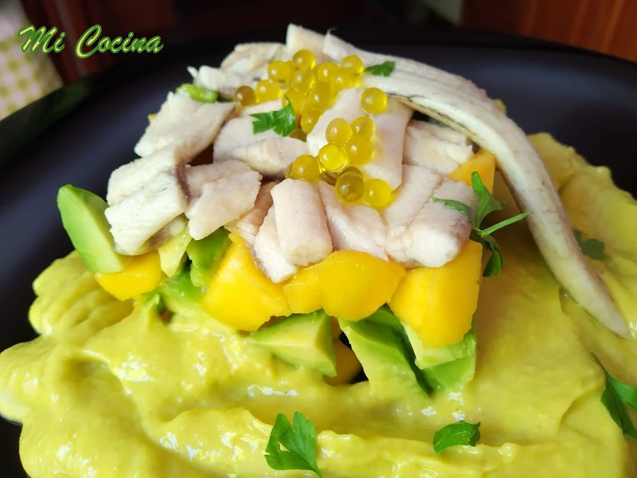 Y eso me ocurre a mí, comparto lo que cocino en “Mi Cocina”, pero también aprendo y mucho. Y uno de los platos que me han cautivado, que he aprendido a hacer es el de una genial bloguera, amiga, paleña, malagueña como yo, Conchi Garcia, autora del blog "Mis Comiditas", quien preparó éste plato para el concurso del Restaurante KGB Málaga (en ÉSTE ENLACE lo cuento con todo detalle). Ella le denominó Tartar de Boquerones Malagueños con Gazpacho de Aguacate y Mango.