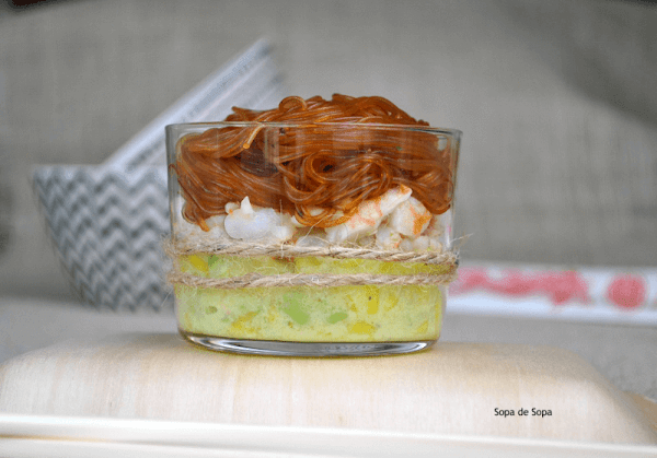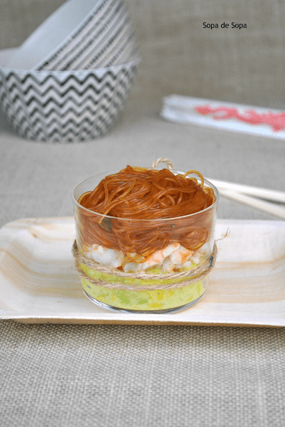 Para servir; Repartir en un vaso por persona la mezcla de melocotón con aguacate, encima poner una capa de gambas y ahora colocar los fideos chinos escurridos encima. Sazonar un poco en caso necesario. Terminar decorando con los cacahuetes ( A mi se me ha olvidado a la hora de fotografiar) y un poco de chile encima.