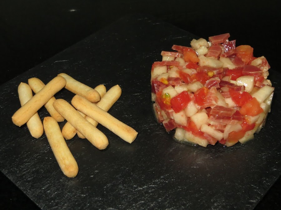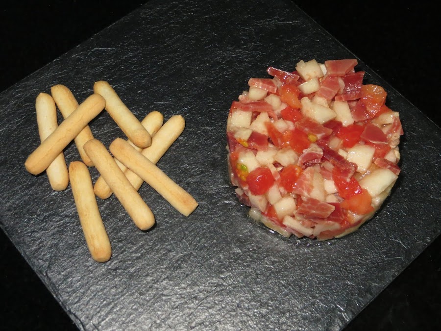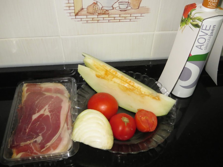 Picamos el melón, el jamón y la cebolla en trozos pequeños. Pelamos el tomate y lo picamos como el resto de los ingredientes lo echamos en un bol y lo regamos con un buen chorro de aceite de oliva. Le damos varias vueltas y se puede comer desde el propio bol o colocarlo con un aro de emplatar para que quede más bonito.