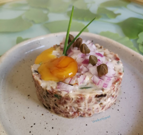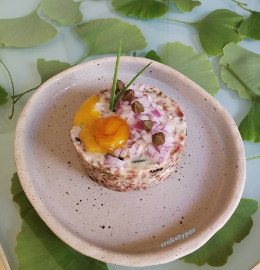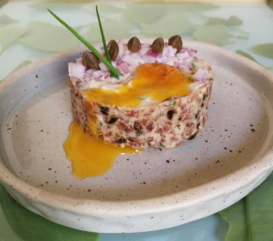 INGREDIENTES: Para 1 tartar de 8 cm. 75 gr. de salchichón ibérico que este tierno (eso es importante), uvas pasas moscatel sin pepitas, alcaparras en salmuera cebollino fresco, media cucharadita de mostaza, un poco de vinagre balsámico, un gotas de siracha, cebolla morada picada. Salsa de soja.