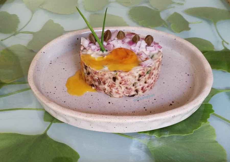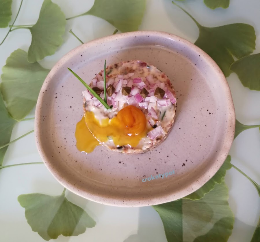 Para montar el plato, ponemos en un aro de cocina la mezcla. La yema curada, la cebolla morada picada y unas alcaparras para decorar.