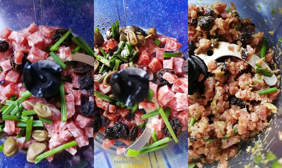 Partimos el salchichón sin piel a cuadros y lo ponemos en la picadora troceado, con las pasas, las alcaparras, un poco de cebollino, unas gotas de vinagre balsámico y trituramos la mezcla. Reservamos.