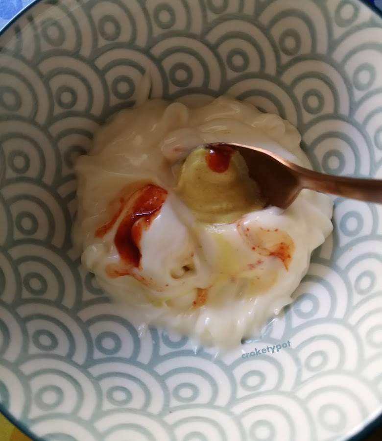 Ahora elaboramos una mayonesa espesa con el huevo, ajo, aceite de oliva y sal.