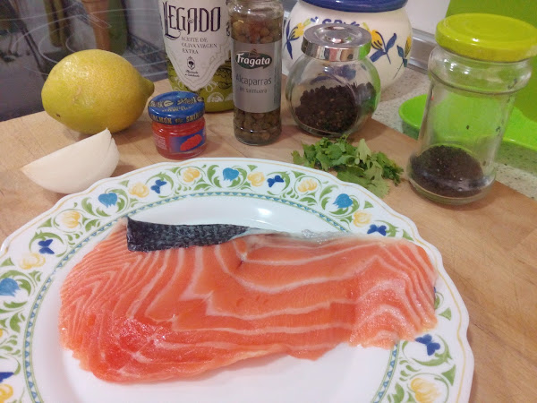 Un filete de lomo de salmón (pesó unos 200 grms. aproximadamente) , una cucharada sopera de alcaparras, el zumo de un limón, una ramita de cilantro fresco, pimienta negra, sal, un trozo pequeño de cebolla fresca (blanca dulce, tipo cebolleta), medio vaso pequeño de aceite de oliva virgen extra.