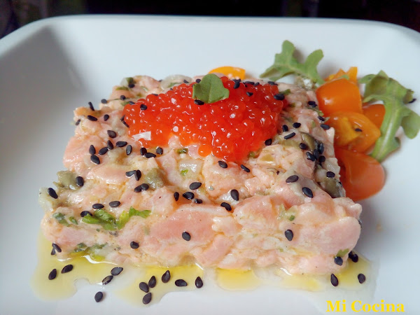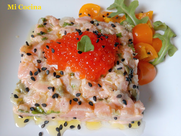 Para ello, colocar un molde en el centro del plato y echar dentro todo el marinado. Retirar con cuidado el molde, poner en el centro una buena cucharada de hueva de salmón y espolvorear con sésamo negro.