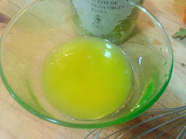 En otro recipiente echar el zumo de limón, un pelín de sal y el aceite, removiendo con unas varillas todos los ingredientes a fin de que emulsionen.
