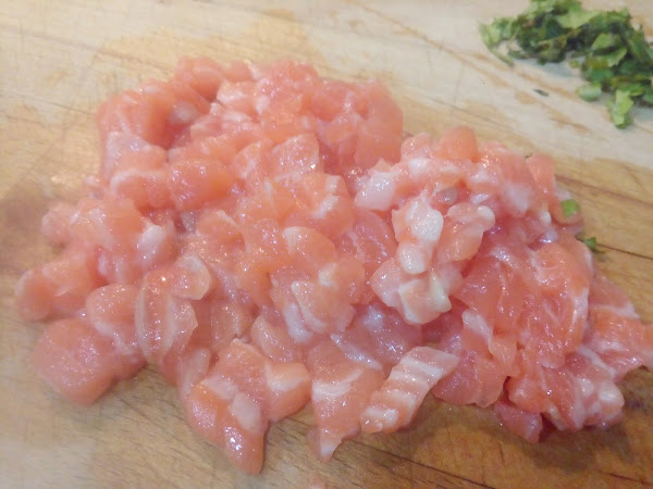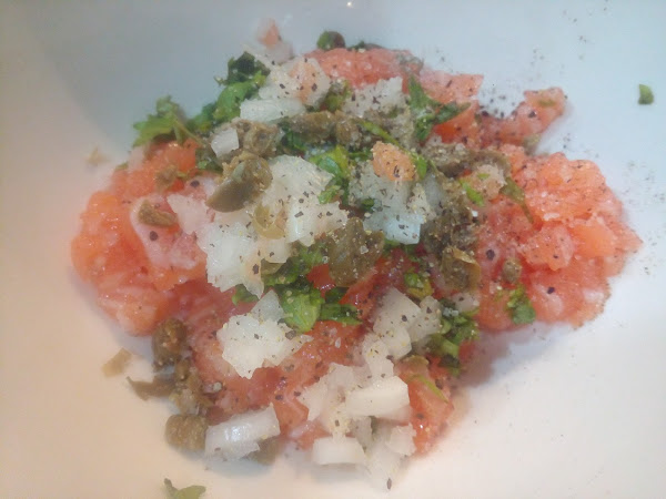 Cortar el salmón, la cebolla, el cilantro y las alcaparras en trozos pequeños.
