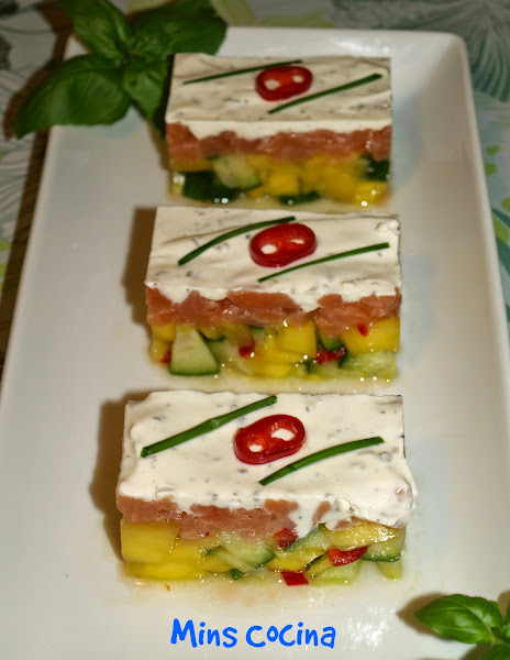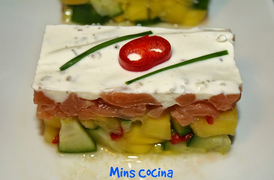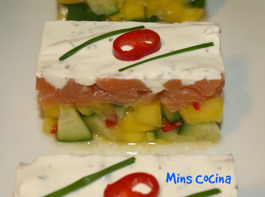 Hacía tiempo que quería preparar esta receta. Me encanta el salmón en cualquiera de sus formas, y la idea de añadirle mango y pepino, otros dos ingredientes favoritos, el toque picante, el aroma del jengibre y la suavidad de la crema con el toque de mostaza me resultaba simplemente fantástica. Menuda mezcla! Ideal como entrante, queda precioso y delicioso. Para impresionar!