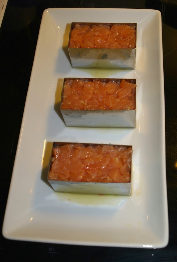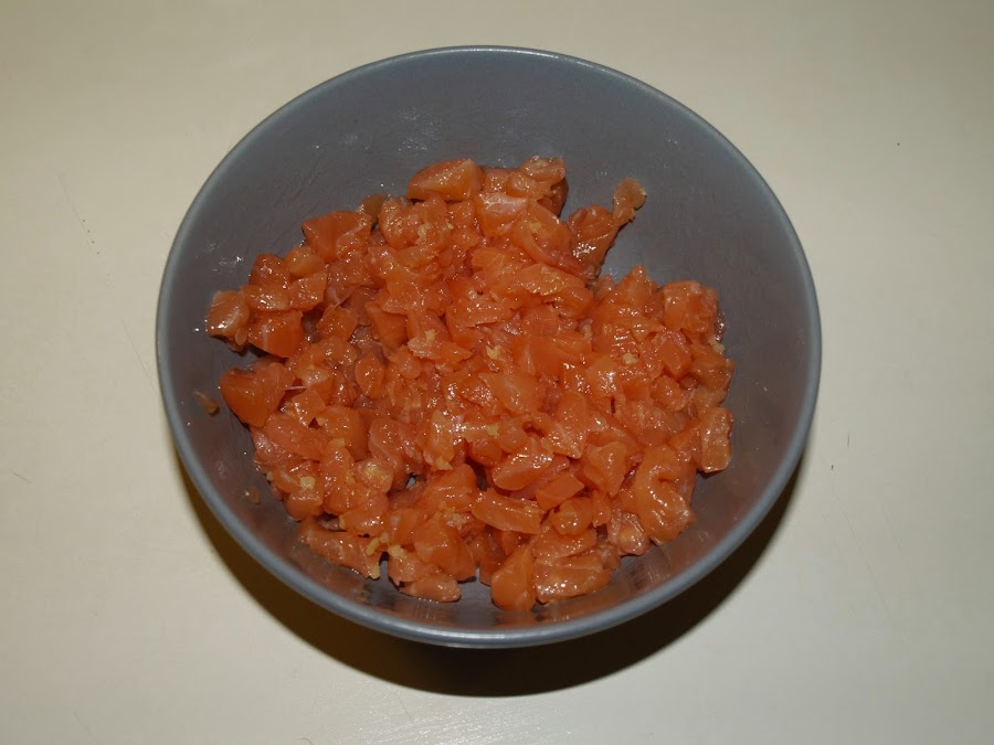- Empezamos con el tartar de salmón. Cortamos el lomo en trocitos pequeños.