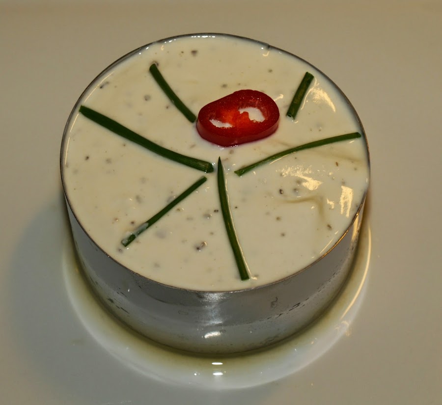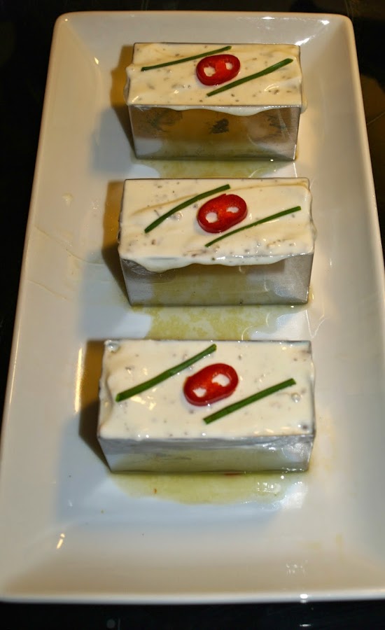 - Terminamos de rellenar los moldes con la crema y adornamos con un poco de cebollino y el resto del chile cortado en rodajas. A mí me salieron tres moldes pequeños rectangulares y uno circular (no tenía más rectangulares). Meten¡mos a la nevera a refrigerar hasta la hora de servir.