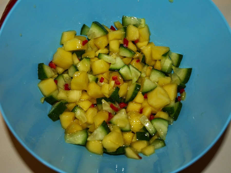 - Cortamos igualmente el pepino y lo mezclamos con el mango. Añadimos un poco de sal, vinagre de arroz y chile picado. Mezclamos bien.