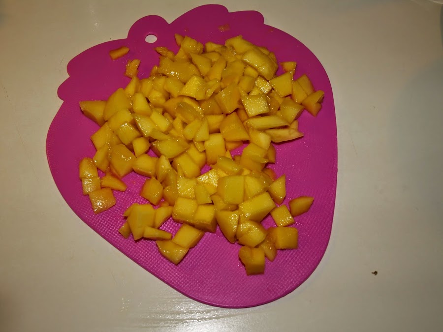 - Pelamos y cortamos el mango en cuadrados no muy grandes.