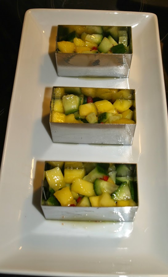 - Pasamos a preparar el plato: En una bandeja ponemos los moldes de emplatar Y rellenamos el fondo con la mezcla de pepino y mango.