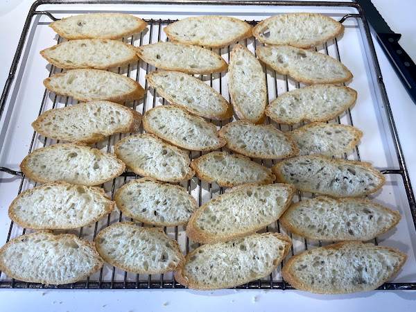 Calentamos el horno, cortamos rebanadas finas de pan y lo tostamos.