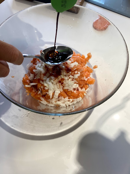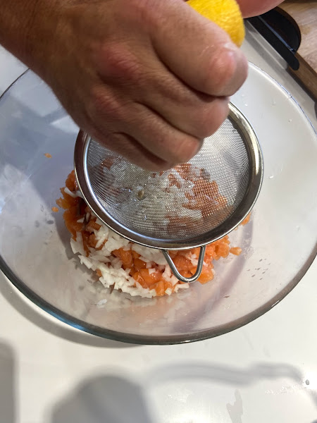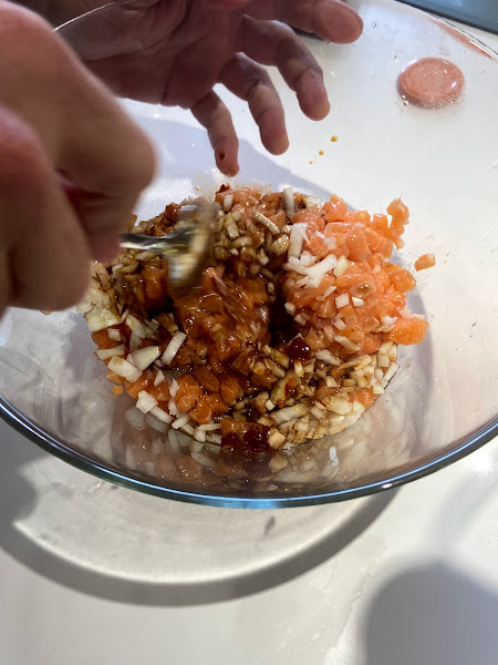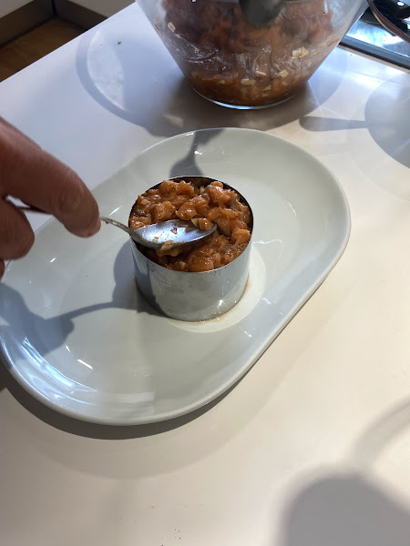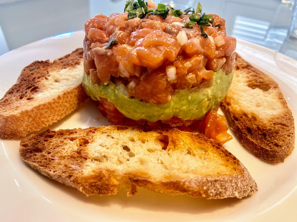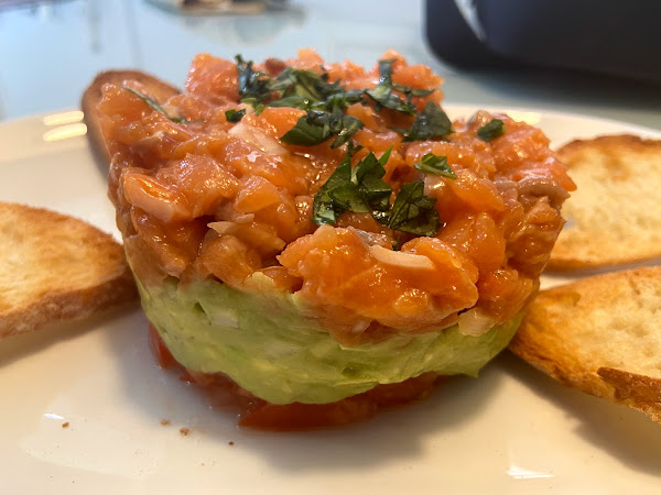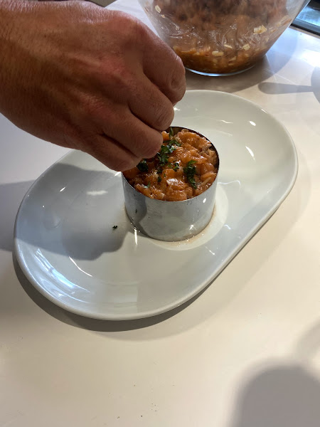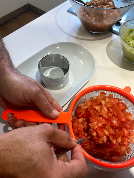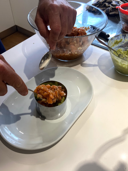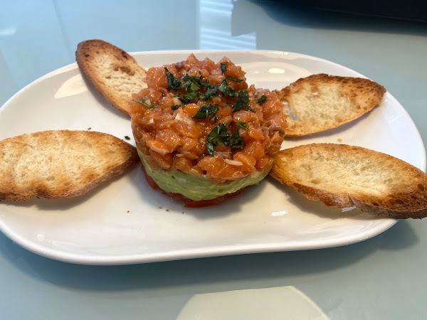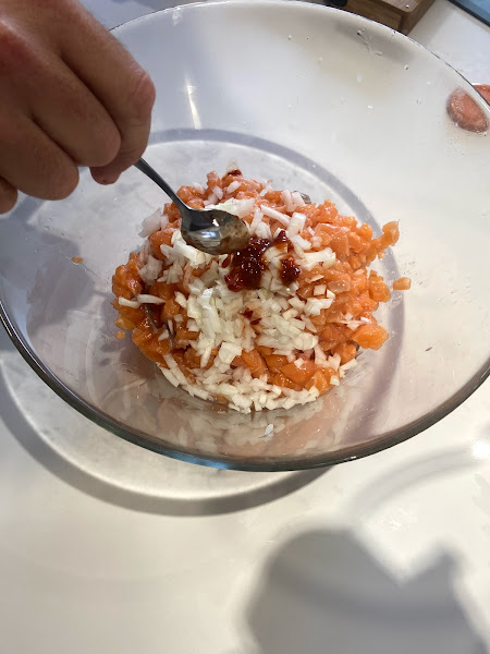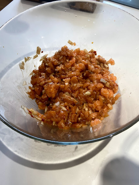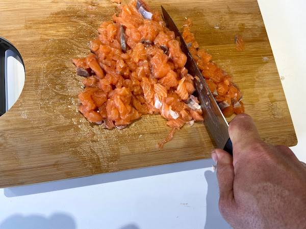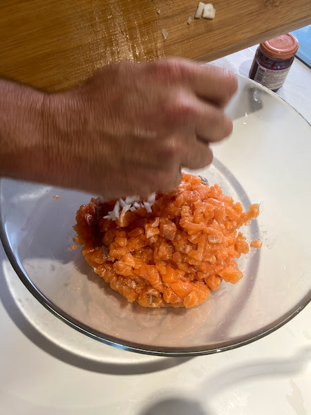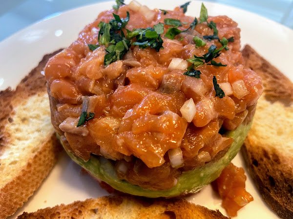 Hoy toca cocinar un plato de pescado, un tartar de salmón. Hace unos días colgamos la receta de Salmón en papillote, para ello compré un salmón entero y medio lo hice en papillote y el otro medio lo vamos a cocinar hoy en tartar.
