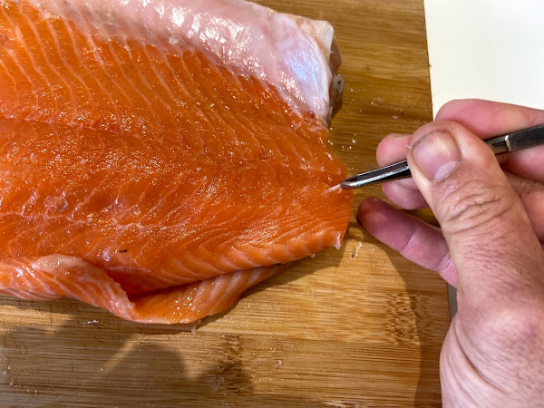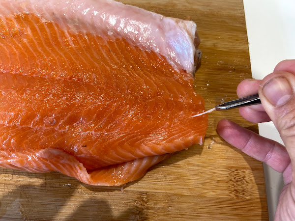 Quitamos la piel al salmón.Con la ayuda de una pinza sacamos las espinas que todavía hay en los lomos, es muy fácil.