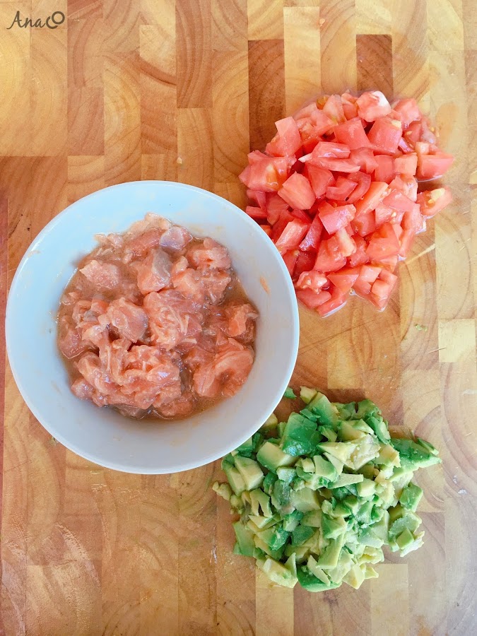 1. Limpiamos bien el salmón, de piel y espinas, y lo picamos en trozos pequeños. Lo ponemos en un bol y añadimos la salsa de soja, el limón exprimido y el aceite de oliva. Tapamos el bol con papel film y lo dejamos macerar en el frigorífico entre 30-45 minutos. El salmón que vamos a usar estará previamente congelado. Yo lo compro fresco y luego lo congelo por lo menos 48 horas para evitar posibles bacterias.