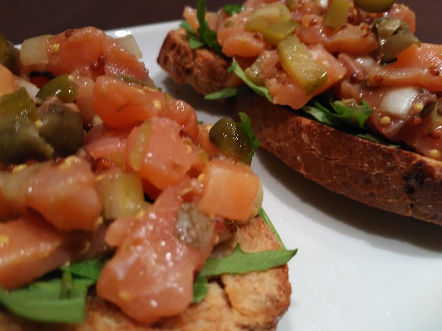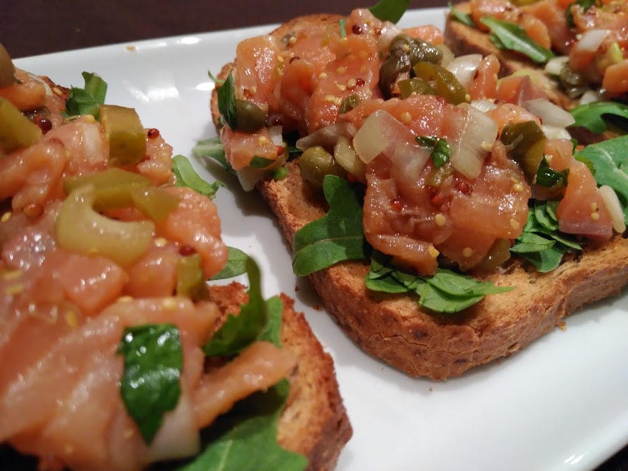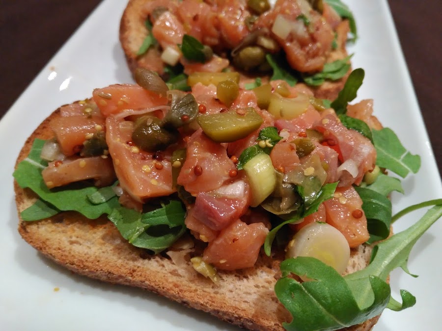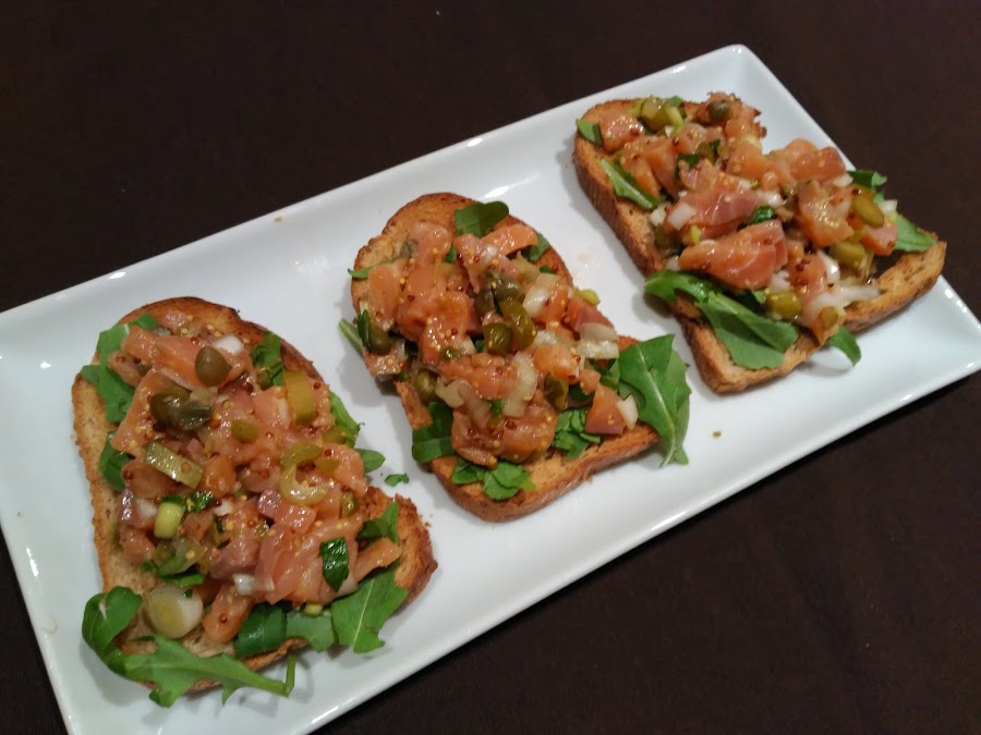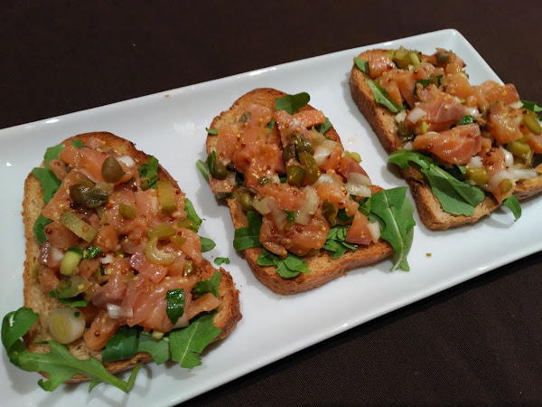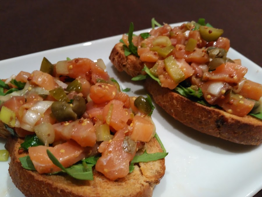 - En el momento de servir, cubrimos las tostadas con el tartar y servimos. Una delicia!