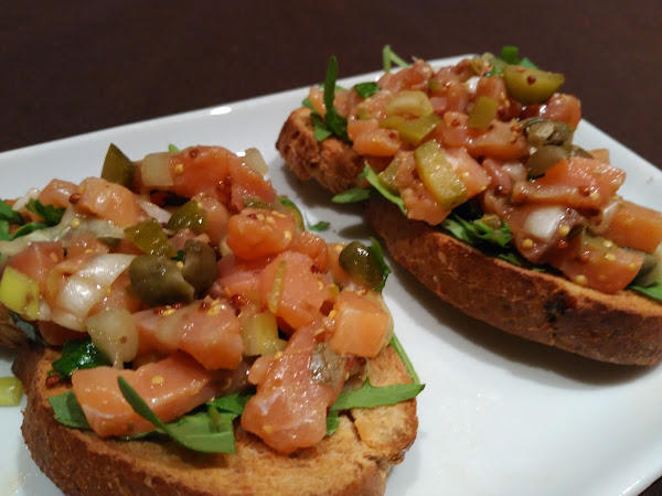 Un plato que tenía muchísimas ganas de hacer y que voy a repetir muchas veces. Está muy rico, y de cara a las fiestas me van a hacer la ola. Lo único a tener en cuenta, es no cubrir las tostadas con el salmón mucho antes de servirlas. Mejor tener todo a punto por separado y montarlo justo antes de servir, para no reblandecer las tostadas. Veréis que rico!