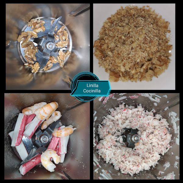 2. Ponga en el vaso los palitos de cangrejo y 10 langostinos cocidos. Trocee 5 seg/vel 4. Reserve.
