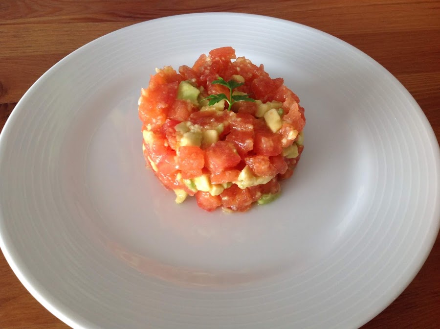 Todos conocemos el típico steak tartar que se hace con carne y una yema de huevo encima, pero, al igual que con muchas recetas, podemos hacerlo con otros ingredientes que, tratados de la misma forma, nos pueden resultar un entrante sano, rico y saludable, como este con tomate y aguacate.