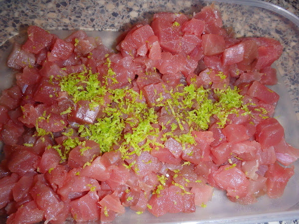 Posem la tonyina picada a marinar amb la marinada que teníem preparada durant 20 minuts o mitja hora.