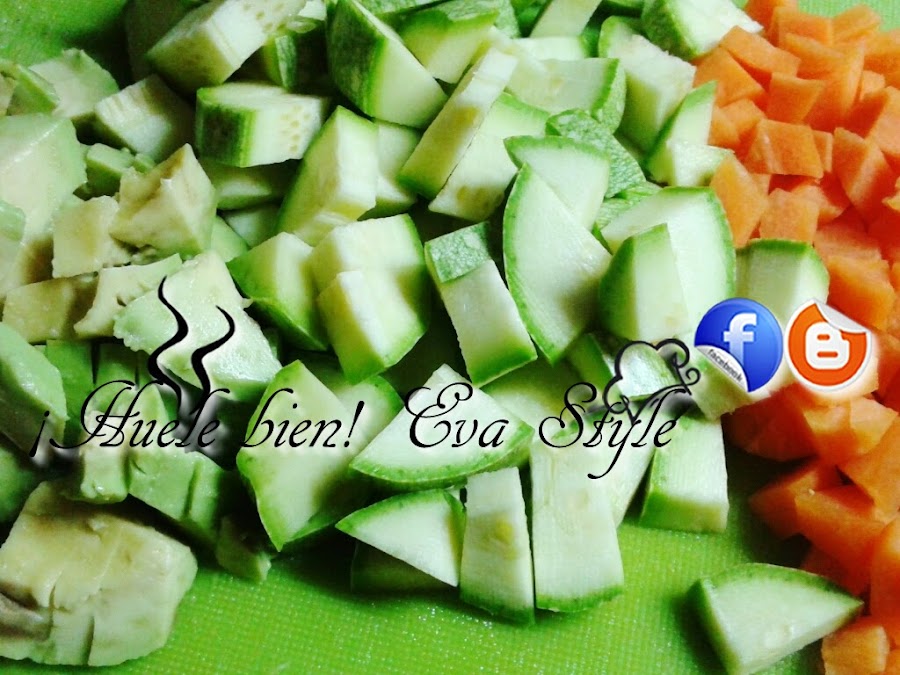 1.- Despuntamos el calabacín, lo lavamos y secamos. Pelamos 3 tomates y retiramos las semillas. Lavamos y pelamos las zanahorias. Cortamos las verduras en dados pequeños.