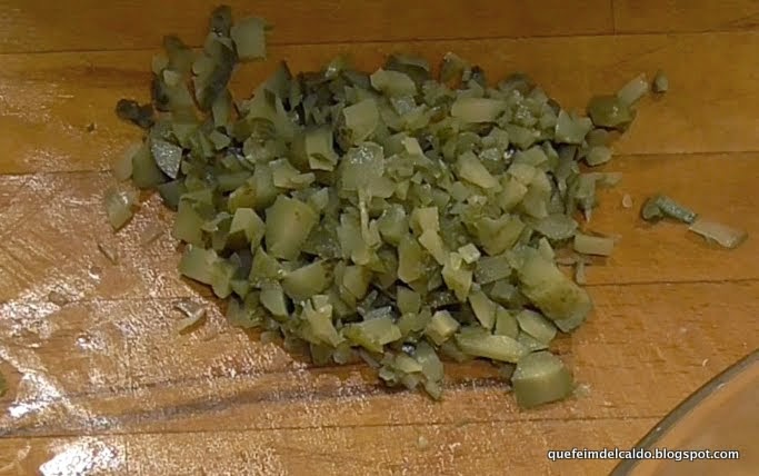 Picamos unos pepinillos en vinagre muy finos y los introducimos en el bol.