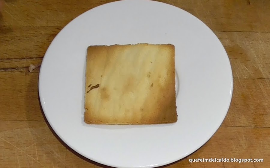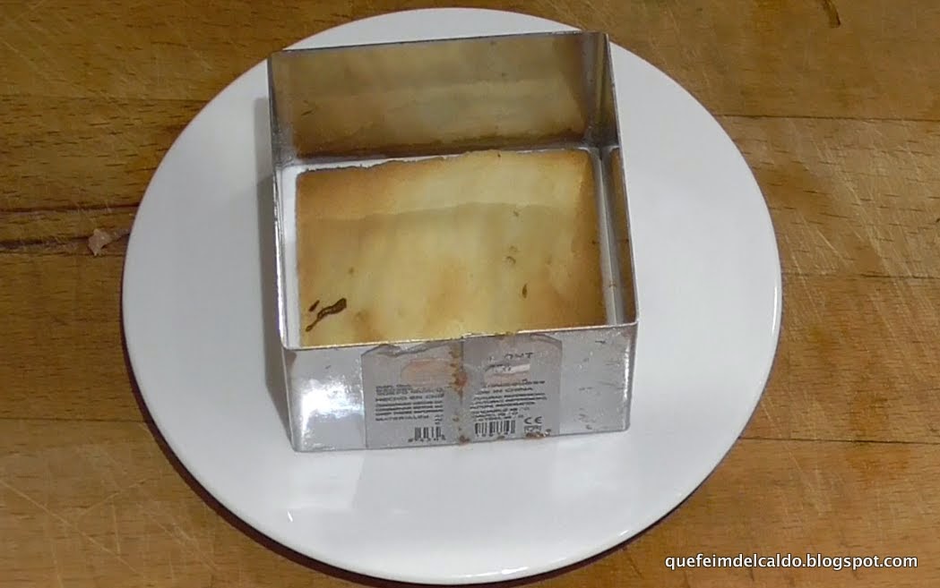 Montamos el plato de la siguiente manera, con la ayuda de un molde para empatar cortamos un poquito de oblea de almendra.