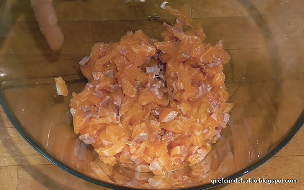 Una vez hechas las obleas nos ponemos a hacer el tártaro, para ello cortamos muy fino a cuchillo el salmón.