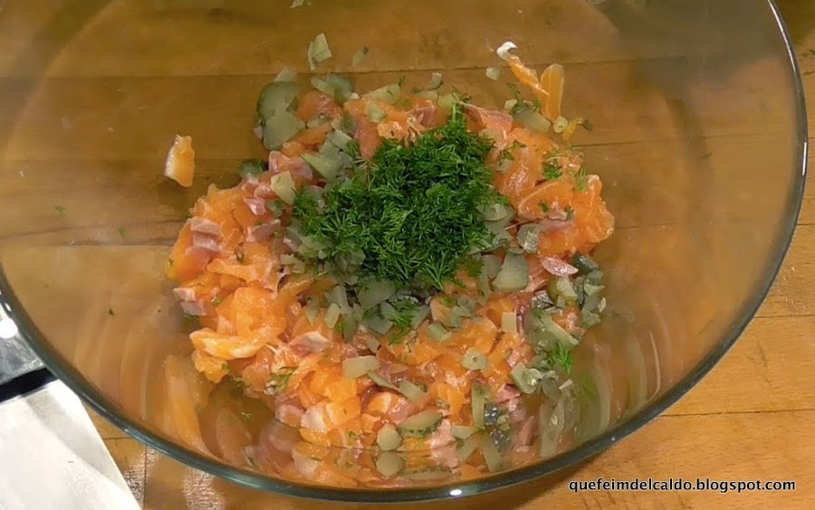 Picamos eneldo fresco y lo hacemos muy fino, lo incorporamos al bol.