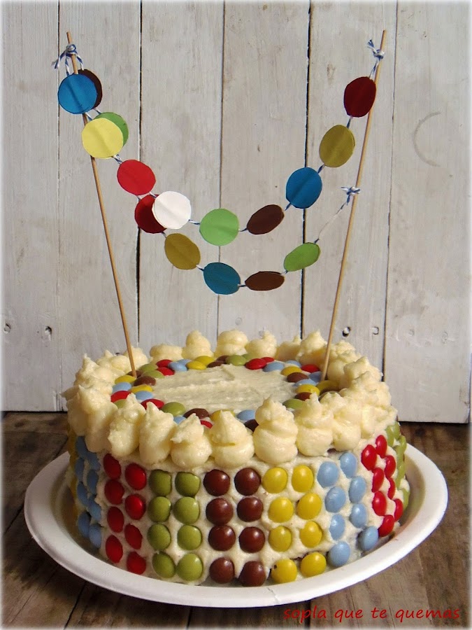 Ponemos la crema entre capa y capa y después cubrimos toda la tarta, con una espátula la dejamos lo mejor posible (cuantas mas tartas se hacen mejor va quedando) y la decoración ya corre a cuenta de la imaginación de cada uno.