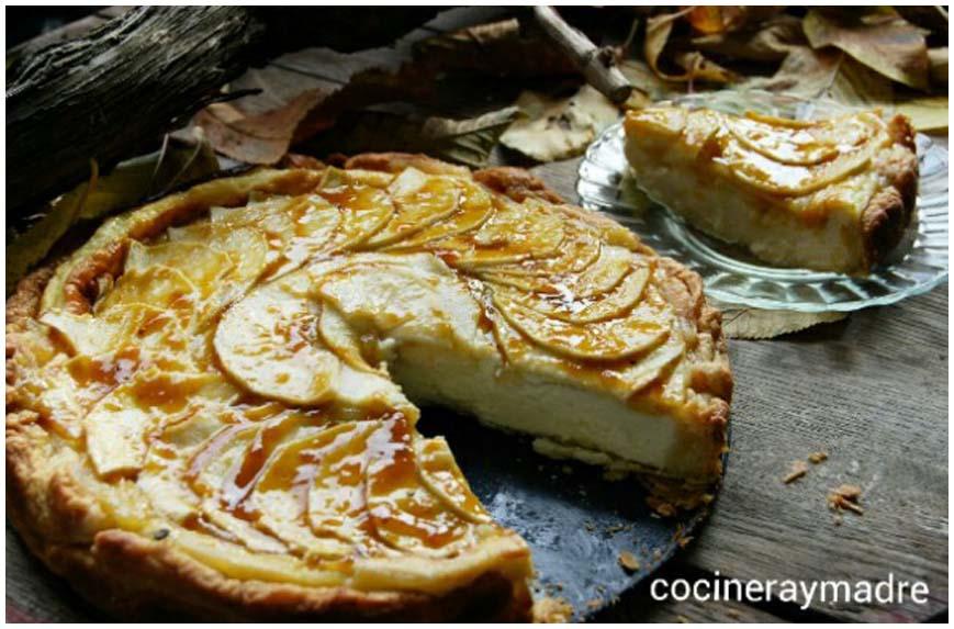 A mis hijos les encantan los quesitos y tenía pensado hacerles un día una tarta de queso con base de galleta que también les encanta, pero cuando vi esta propuesta cambie ligeramente el concepto. En lugar de galleta, hojaldre y con una compota rápida de manzana y láminas de esta por encima.