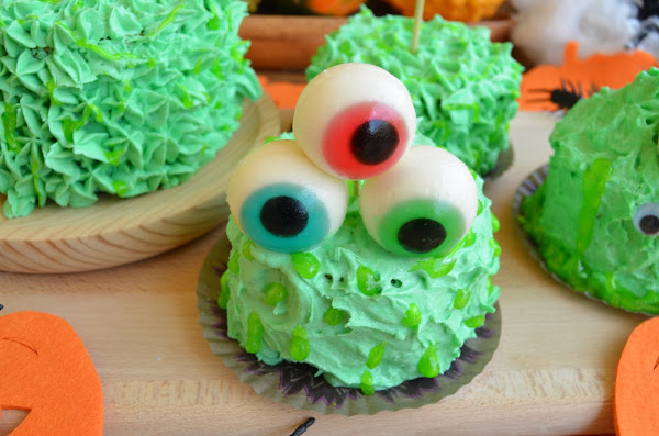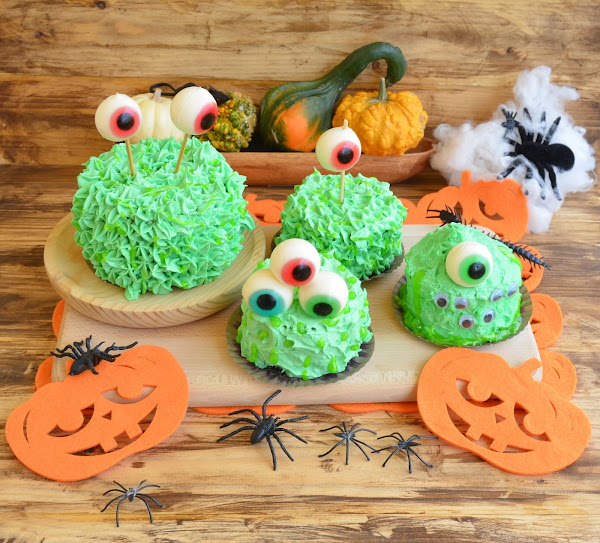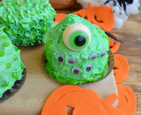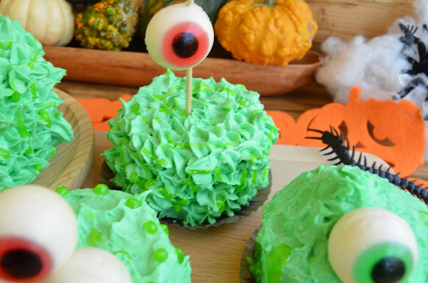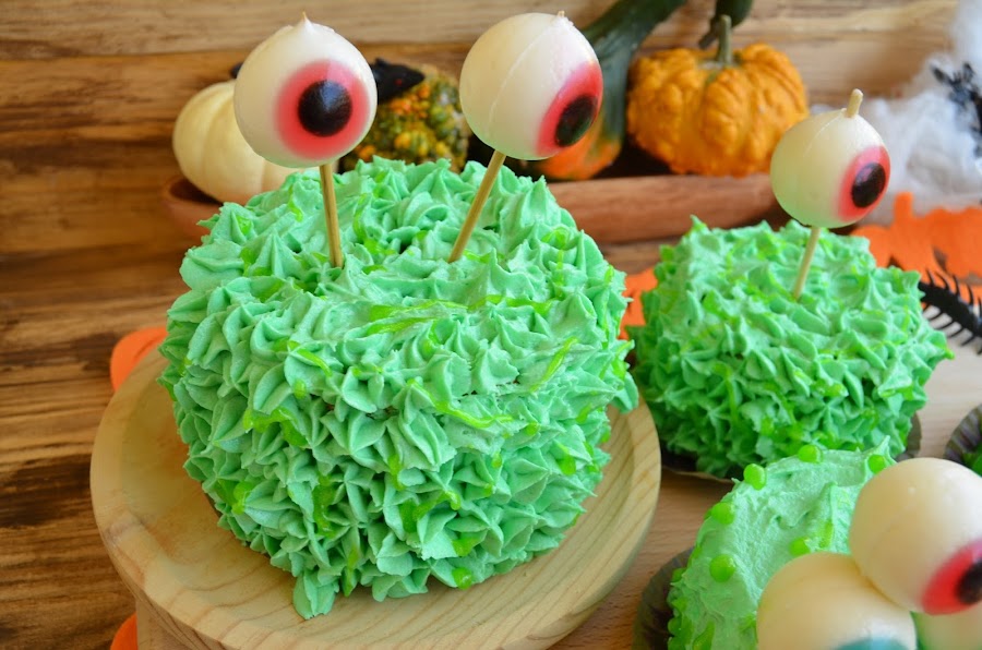 Solo nos queda decorar, metemos la buttercream en una manga pastelera con una boquilla de estrella pequeña y vamos haciendo piquitos, en otros simplemente le he puesto la buttercream y lo untado con el dedo dando golpecitos para que le salgan defectos, decoramos un poco con el gel brillante verde y le colocamos los ojos.