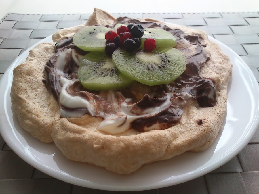 Merengue, frutas, chocolate, queso crema... todo junto, de lo más sugerente. Lucía, del blog De pucheros y otros, nos propone una Pavlova de chocolate y queso, coronada con deliciosas frutas frescas. Preparar el merengue es fácil, y con él conseguiréis una base para vuestras tartas totalmente diferente a la que estáis acostumbrados.