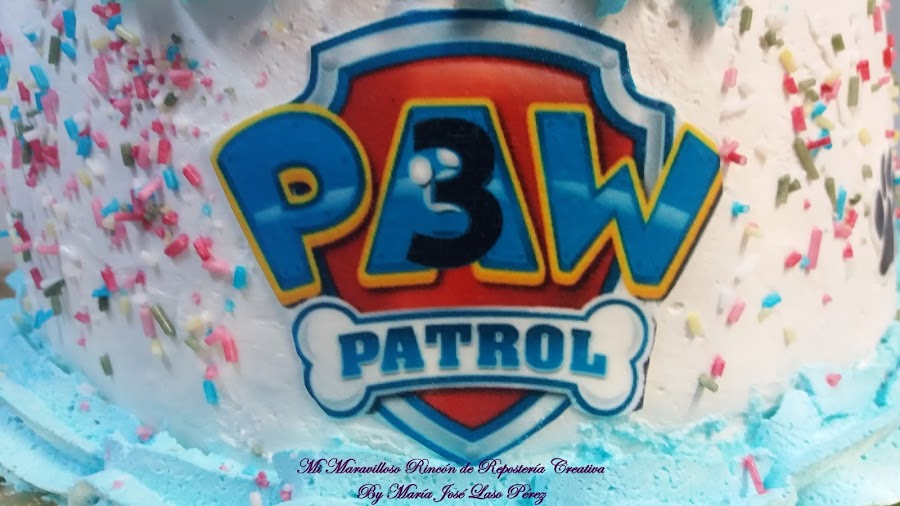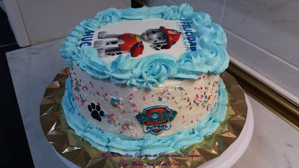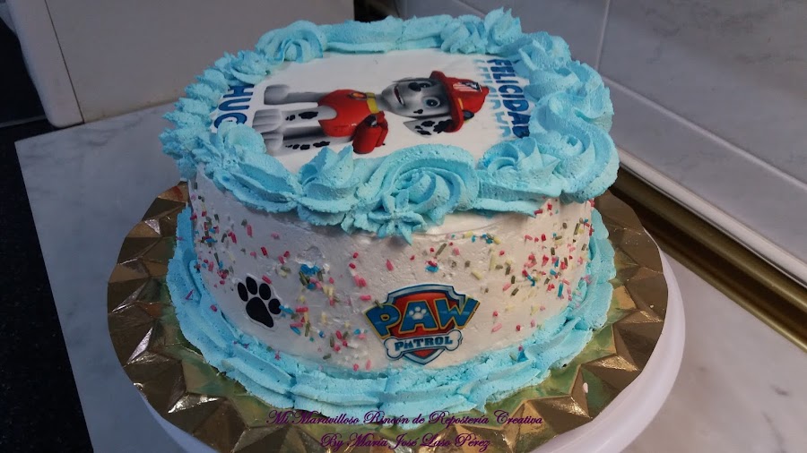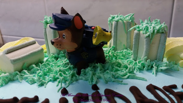Ahora os voy a mostrar la segunda tarta, para celebrar con los amigos. El bizcocho y el relleno, fueron exactamente iguales, ya que les gustó mucho la primera y quisieron repetir. Pero en esta ocasión cambiamos de personaje, esta vez le tocó el turno a Chase, un pastor alemán policía y espía. Siempre va con su camión de policía y su megáfono. Es el líder de la patrulla.