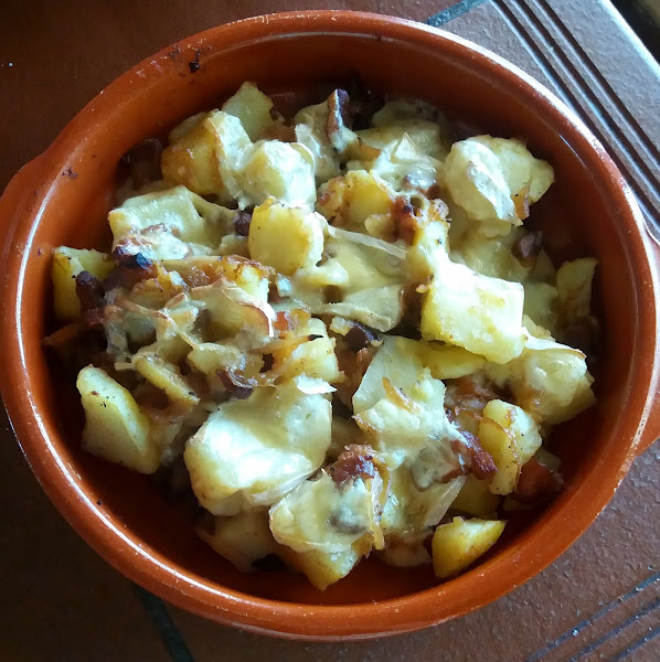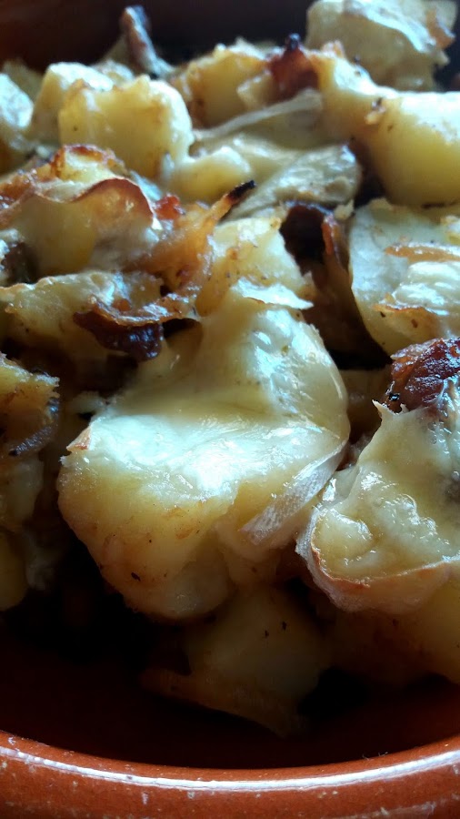 Una vez que las patatas estén listas, dejamos enfriar lo justo para que no nos quememos y les quitamos la piel y cortamos en trozos. Mezclamos la cebolla con la panceta y las patatas y les damos unas vueltas (con suavidad, no queremos que se nos deshagan las patatas) , para que se mezclen los sabores,salpimentamos ligeramente y guardamos . Mientras, ponemos el horno a calentar a unos 190-200º. Ya sólo nos queda prepara la mezcla, en un recipiente apto para horno (yo usé uno de barro). Ponemos una capa de patatas, cebolla y panceta y encima unas lonchas de queso, otra capa de la mezcla de patatas y regamos con la nata (crema de leche) o leche evaporada, y terminamos con más lonchas de queso. Metemos en el horno y lo dejamos hasta que esté dorado y burbujeante. Servimos caliente y a disfrutar!!!