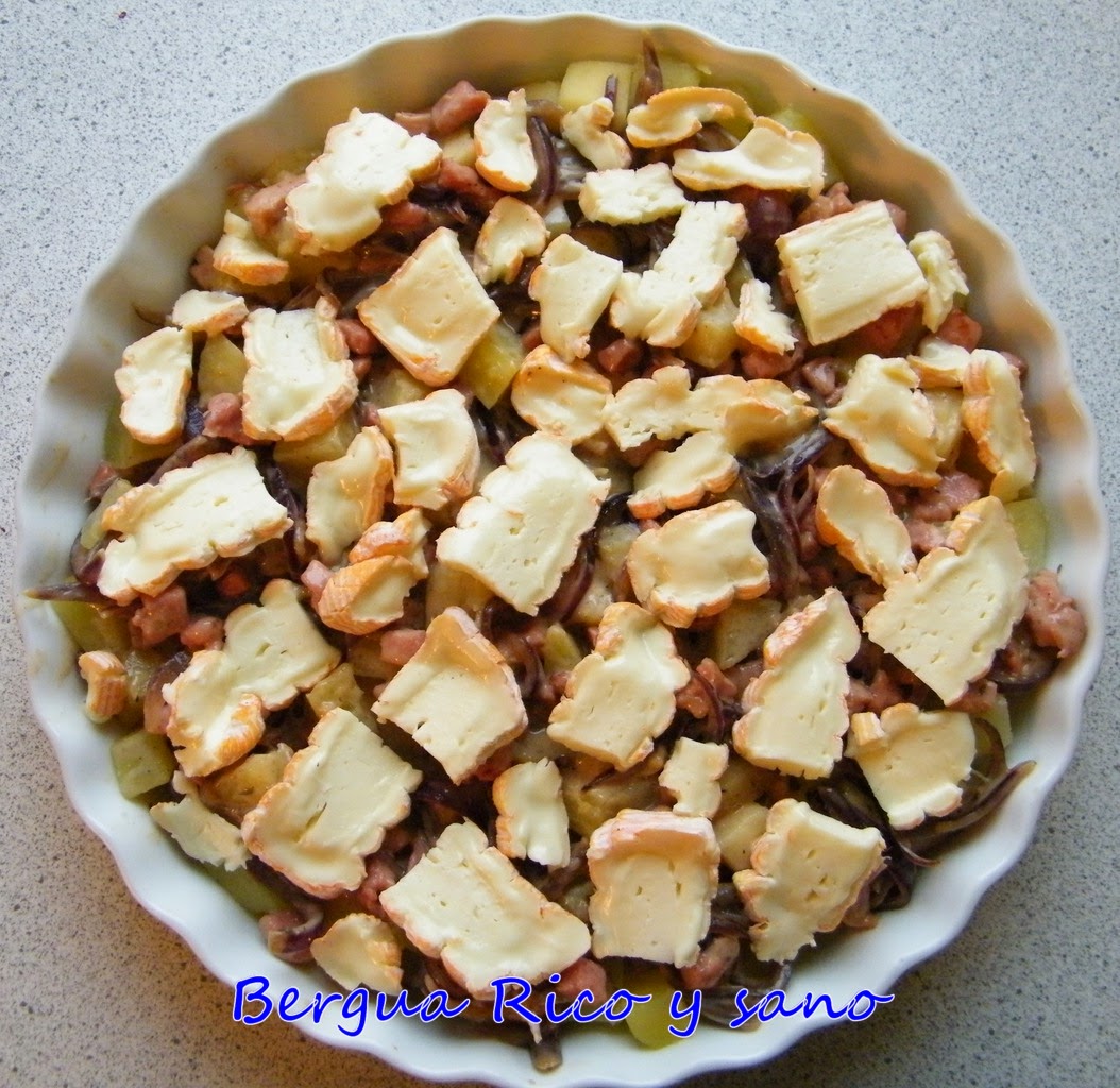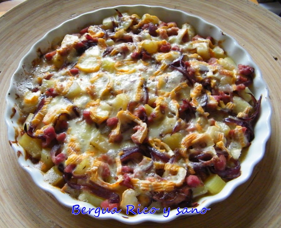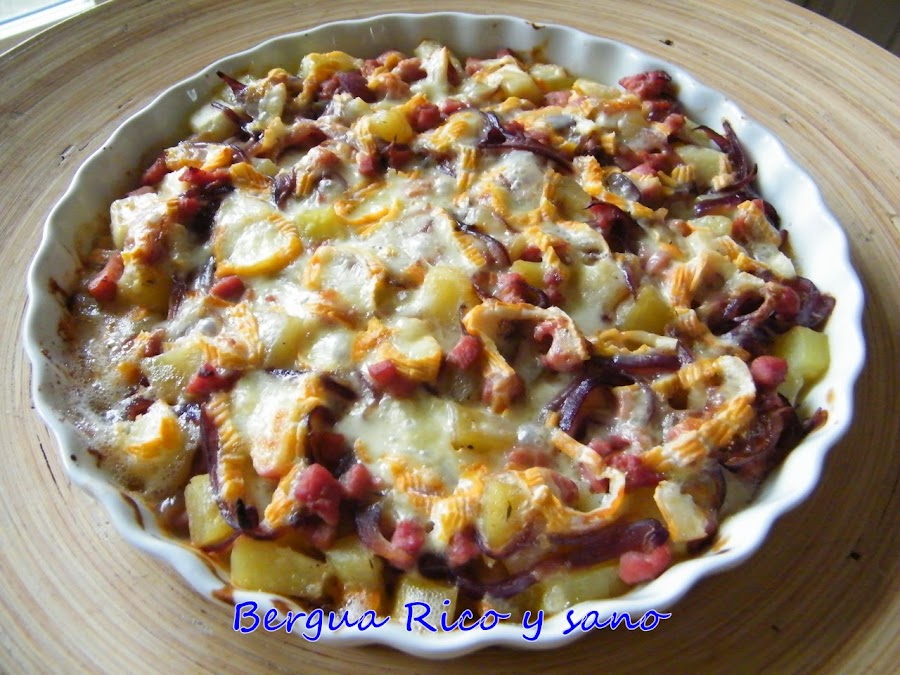 Hoy os traigo este clásico francés con el que participo en la parada de octubre de la ruta gastronómica de Cocinas del mundo. La receta, típica de Saboya y Alta Saboya, consiste en un gratinado de patatas cocidas, cebolla, bacon (panceta), nata (crema de leche), pimienta y en ocasiones vino blanco. He tratado de conservar la autenticidad, pero no he podido concederme alguna que otra licencia de autora: el toque de romero, que queda espectacular, el usar una cebolla morada y el añadir una manzana junto con la patata. Os cuento cómo la he preparado =) Para 2-4.