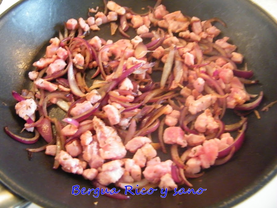 4. Pasados 5 minutos añadimos el bacon en daditos y cocinamos a fuego medio durante unos 8 minutos hasta que la cebolla esté tierna y el bacon cocinado. Entonces rociamos con el vino blanco y removemos hasta que se evapore el alcohol.