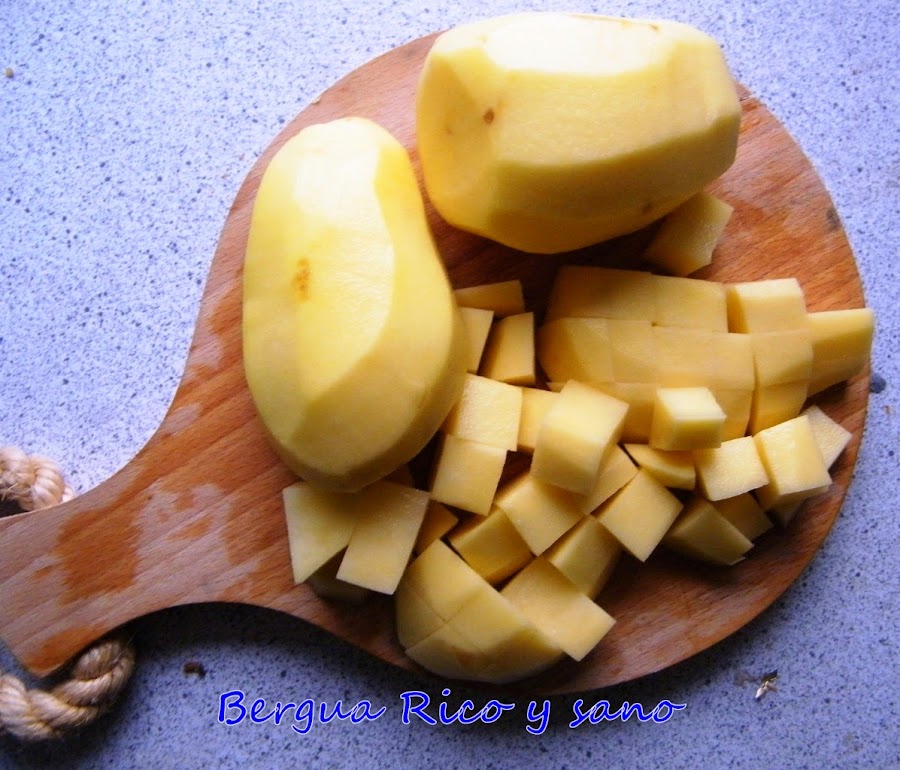 1. Antes que nada vamos a cocer nuestras patatas. Si vamos justos de tiempo, las cortamos en dados antes de hervirlas para que vaya más rápido. Durante el último minuto de cocción añadimos la manzana también cortada en dados. Reservamos.