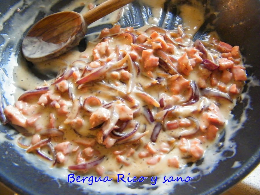 4. Entonces incorporamos la nata (crema de leche), salpimentamos y ligamos con el resto de ingredientes. Retiramos del fuego.